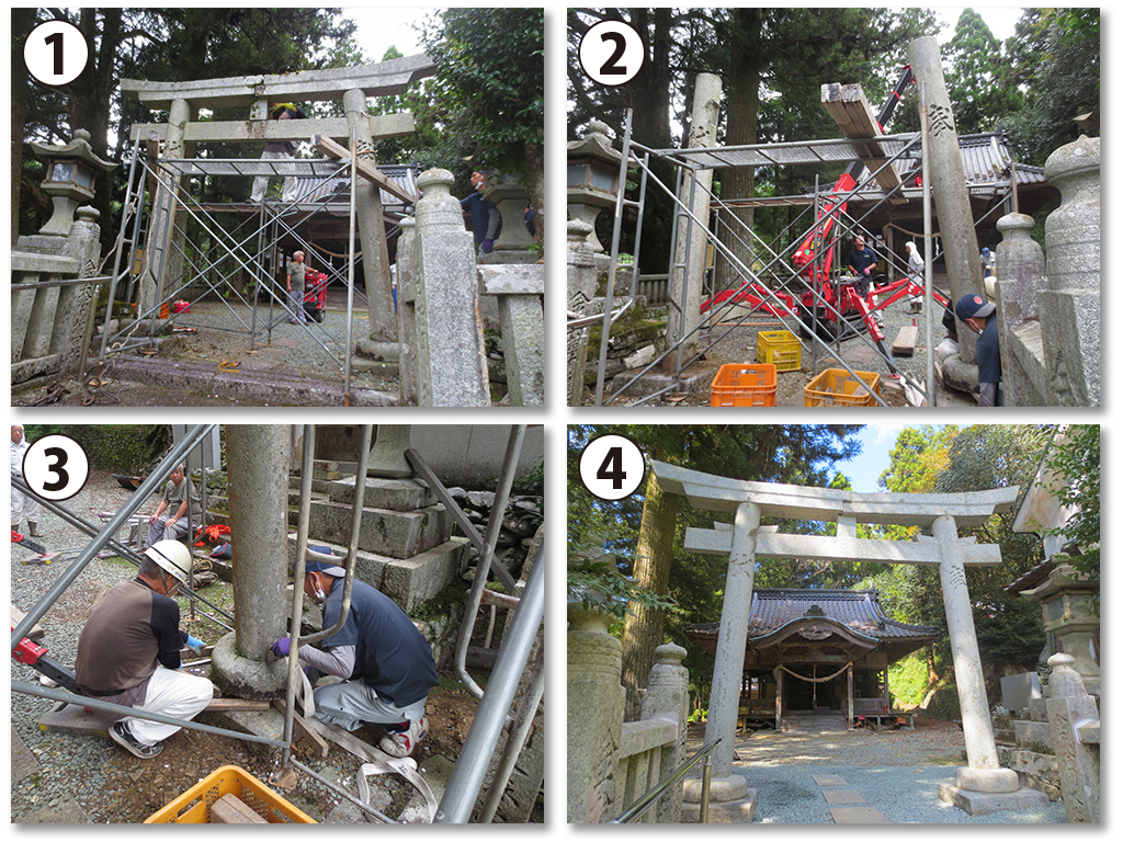 写真は、地元神社の鳥居の修繕を行った際の作業風景です。