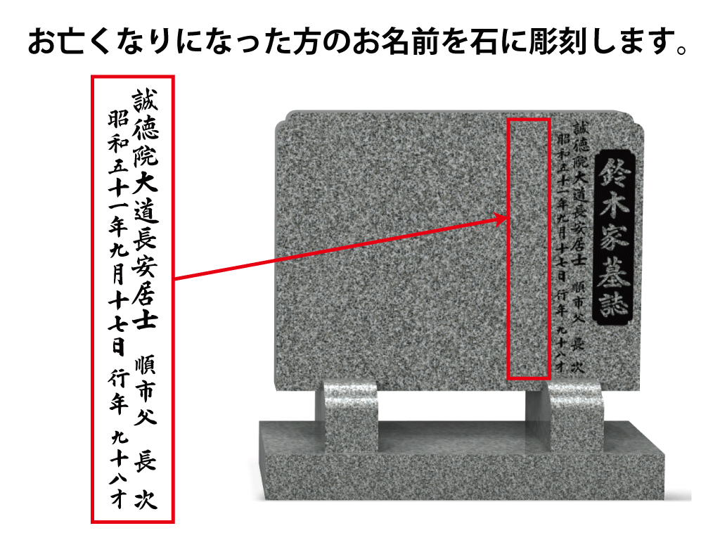 宗派によりますが、戒名・続柄・俗名・没年月日・行年などを彫刻します。